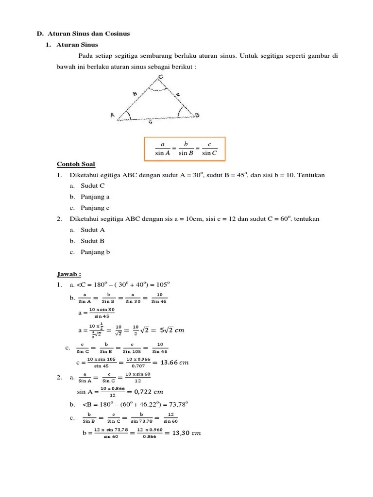 Khusus untuk sinus dan cosinus ternyata mempunyai aturan sendiri dalam sebuah segitiga. Cos 2a 1 2 sin 2 a. Perhatikan gambar pada segitiga berlaku aturan sinus. Berapakah besar dari sudut d? Rangkuman materi bab trigonometri kelas x10 disertai contoh soal dan jawaban dengan pembahasan lengkapnya simak disini.